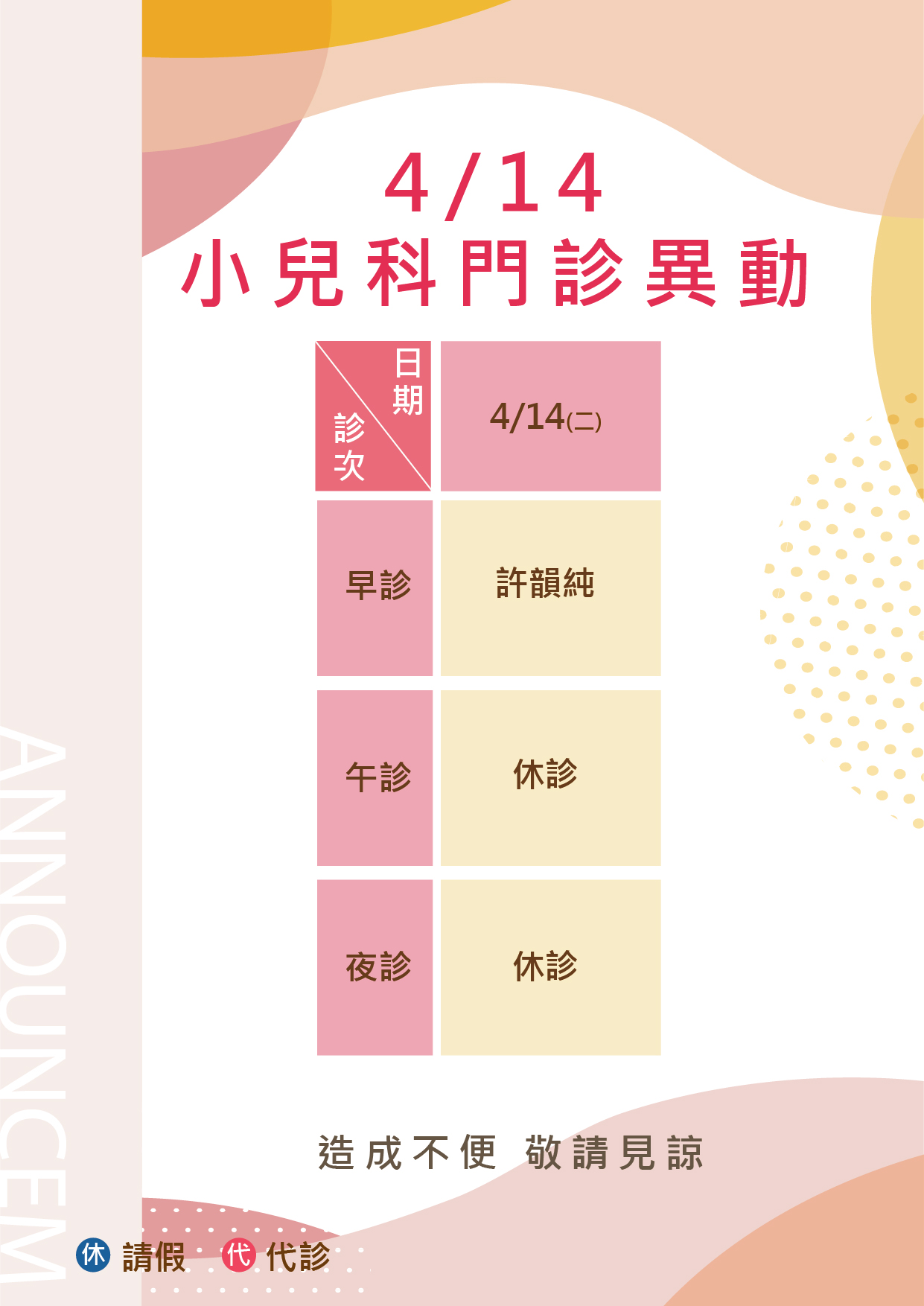 4/14(二) 兒科門診異動