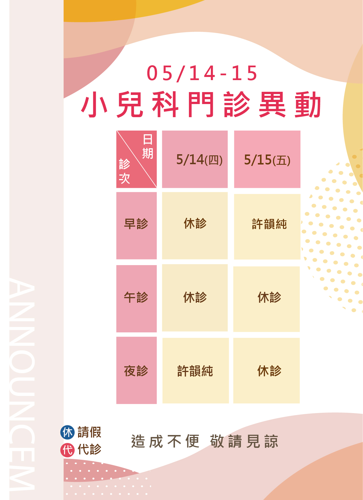 5/14(四)-5/15(五)兒科門診異動